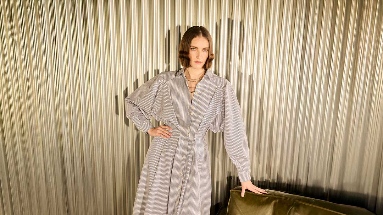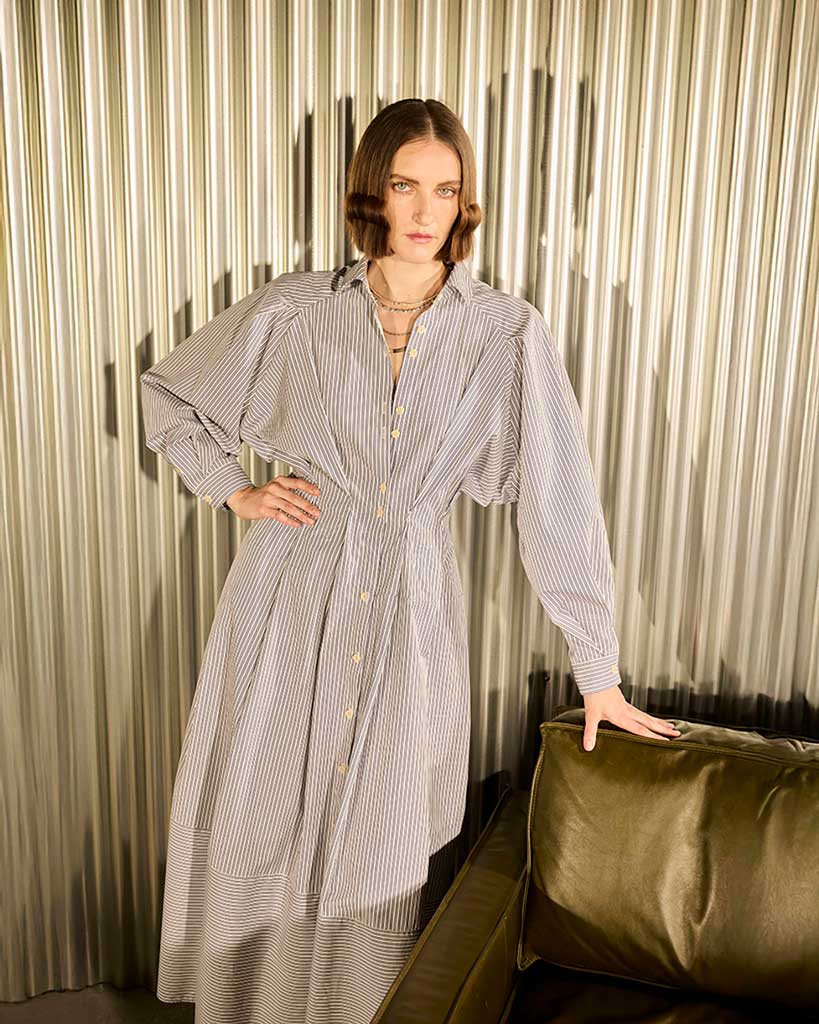 Shaped with intention to follow the body’s natural contours, each pleat breathes with a contrast of precision and ease. The garment becomes a vessel of movement and emotion, where structure softens into poetry in motion. In this delicate balance, masterful craftsmanship unfolds as quiet artistry.